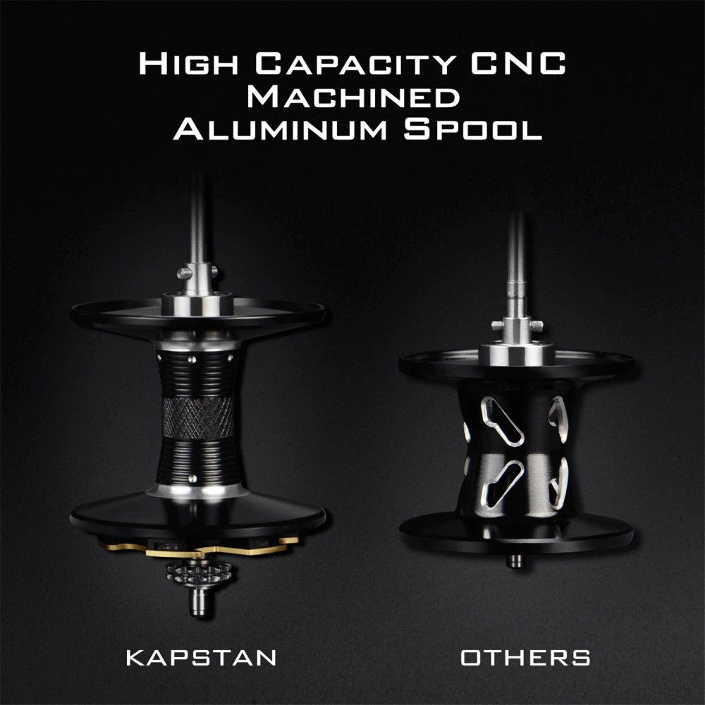 KastKing Kapstan Elite wykorzystuje 8 podwójnie krytych łożysk kulkowych MaxiDur ze stali nierdzewnej oraz natychmiastowe łożysko oporowe, co daje w sumie 8+1 łożysk w kołowrotku. Nakrętka napinająca szpulę ma regulację zatrzaskową, zapewniającą dokładną kontrolę i przy tym nie cofa się. Kołowrotki Kapstan Baitcaster wykorzystują niezawodny i sprawdzony odśrodkowy układ hamulcowy, który eliminuje frustrujące przekroczenia prędkości nawet podczas rzucania ciężkimi przynętami. Kapstan posiada włącznik/wyłącznik głośnej terkotki szpuli.