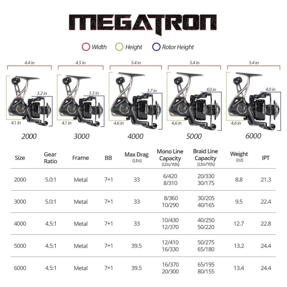 PRZEKŁADNIE JAKOŚCI NA POZIOMIE PRO – Kołowrotki spinningowe MegaTron zapewniają maksymalną wydajność i siłę wszystkim wędkarzom turniejowym szukającym zwycięstwa. Główna przekładnia napędowa wykonana jest z wytrzymałego stopu cynku w połączeniu z zębnikiem wykonanym z litego mosiądzu. Obydwa zapewniają sztywność i gładkość potrzebną do budowy kołowrotków gotowych stawić czoła trudnym warunkom. Kołowrotki spinningowe MegaTron są wyposażone w obrabianą CNC szpulę ze stopu aluminium lotniczego T6061 i ekskluzywną aluminiową korbkę inspirowaną robotem.