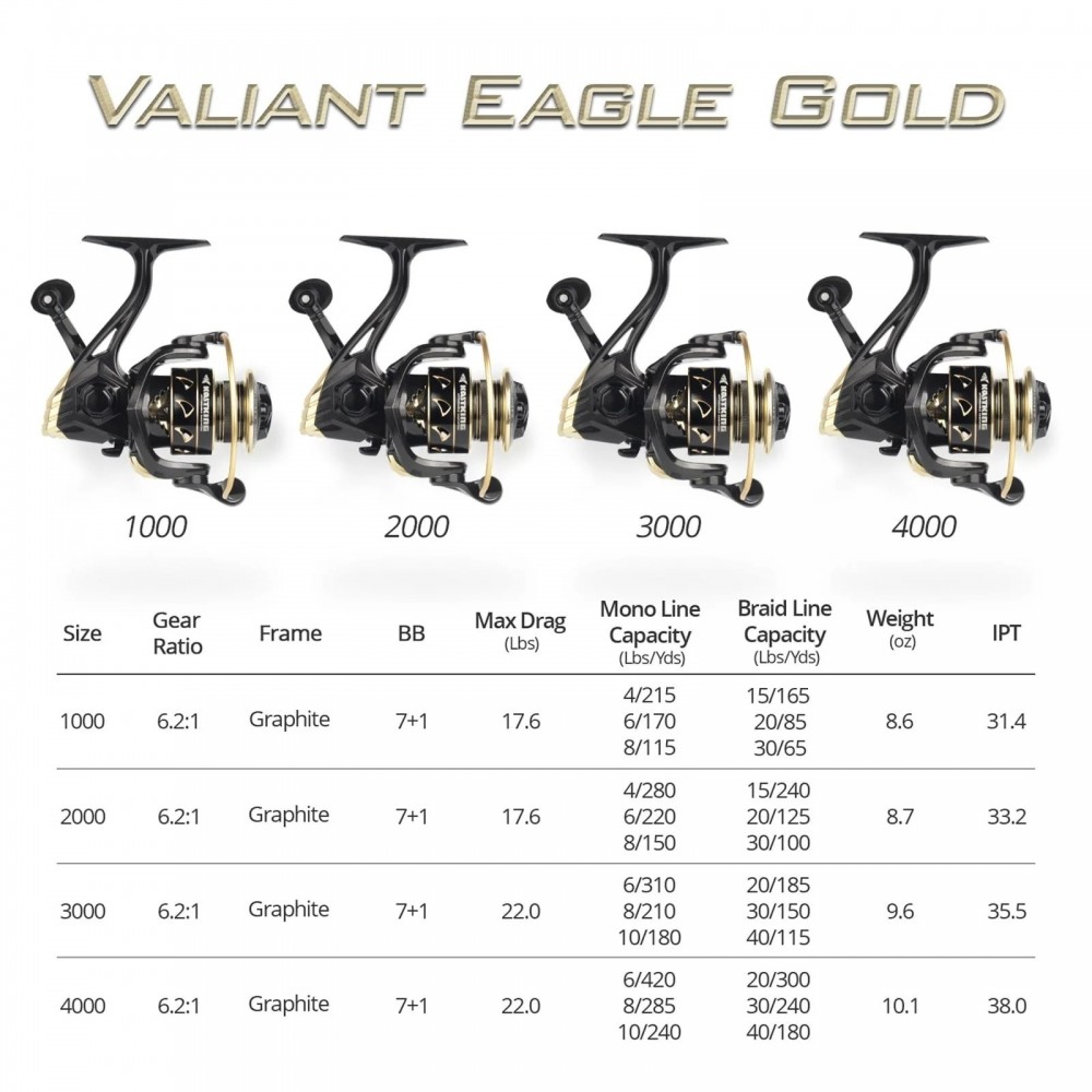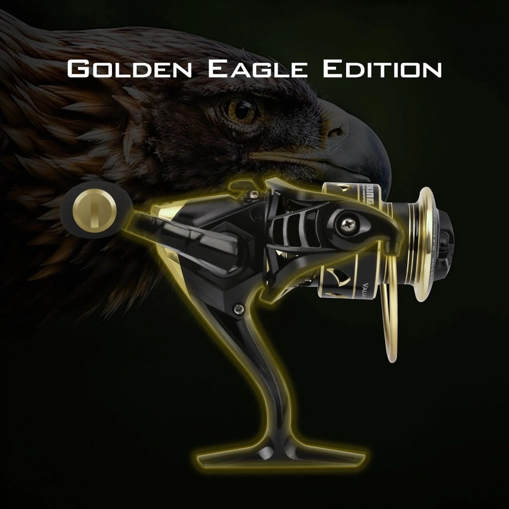 GOLD EAGLE EDITION – Nowy kołowrotek spinningowy KastKing Valiant Eagle Gold jest częścią serii kołowrotków spinningowych Valiant Eagle KastKing. Ta edycja z błyszczącymi złotymi wykończeniami oddaje hołd orłowi złotemu, jednemu z najbardziej znanych ptaków drapieżnych na półkuli północnej. Podobnie jak Golden Eagle, kołowrotek Valiant Eagle Gold Edition został zbudowany z myślą o mocy i szybkości, podobnie jak kołowrotek spinningowy słodkowodny lub słonowodny.