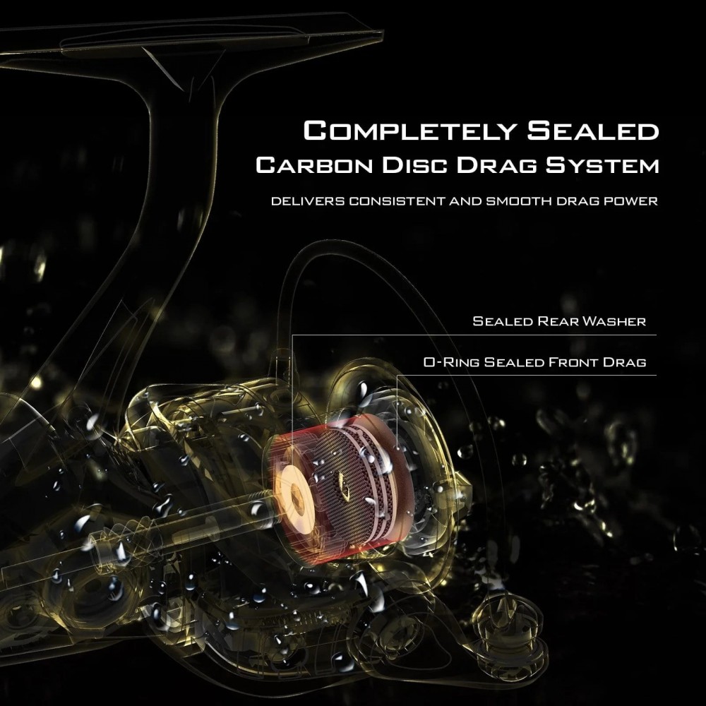 WYDAJNOŚĆ – Uszczelniony układ hamulca z włókna węglowego zapewnia siłę walki wynoszącą aż 10 kilogramów i utrzymuje podkładki hamulca w stanie suchym, aby uniknąć niespójnego działania hamulca. Aby zapewnić stałą wydajność, KastKing wykorzystuje łącznie 7+1 łożysk kulkowych MaxiDur ze stali nierdzewnej, zapewniających wyjątkowo płynne działanie w każdych warunkach.