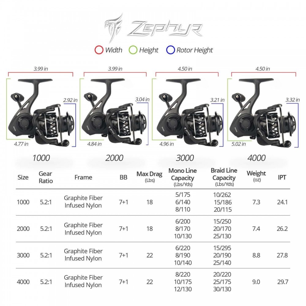 Zephyr, czyli lekki, delikatny wietrzyk, zasługuje na swoją nazwę. Kołowrotki spinningowe z serii Zephyr oferują optymalny wybór dla entuzjastów wędkarstwa ultralekkiego i podlodowego. Rozmiar 500 ważący zaledwie 5,6 uncji i rozmiar 1000 ważący około 7 uncji to idealny wybór, dostosowany do zapewnienia wyjątkowej wydajności w tych specjalistycznych zastosowaniach połowowych. Modele 2000, 3000 i 4000 należą odpowiednio do najlżejszych grafitowych kołowrotków spinningowych. Kołowrotki spinningowe KastKing Zephyr to wysokiej klasy, lekki kołowrotek do połowu okoni i pstrągów, będący doskonałym wyborem jako kołowrotek słodkowodny lub słonowodny.