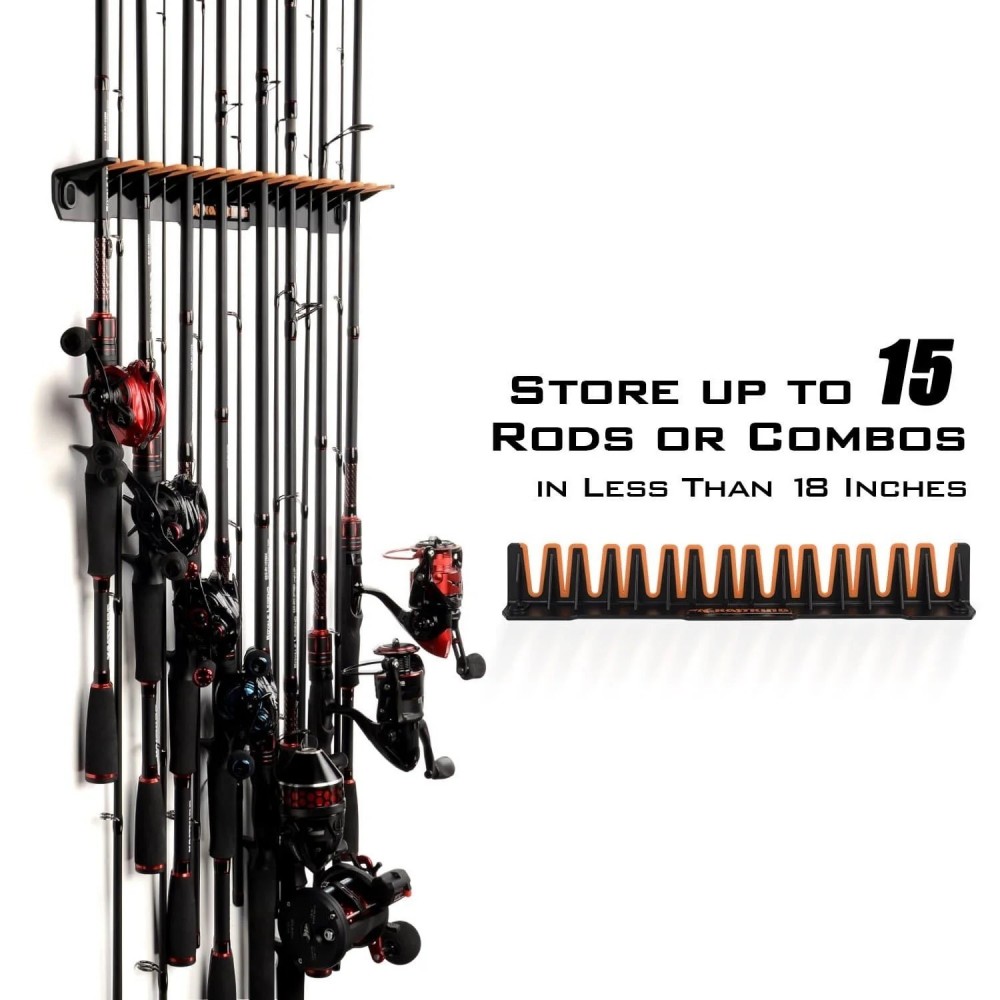 PRZECHOWYWANIE 15 WĘDEK LUB KOMBO – Pionowy stojak na wędki KastKing V15 (patent USA nr 7237685) może pomieścić do 15 wędek na mniej niż 45cm poziomej powierzchni ściany. Większość innych marek przechowuje tylko 6 zestawów na tej samej przestrzeni. Wędki i zestawy można zamontować praktycznie w dowolnym miejscu na całej długości wędki, co pozwala na układanie kołowrotków na różnych wysokościach w celu uzyskania minimalnej przestrzeni do przechowywania.