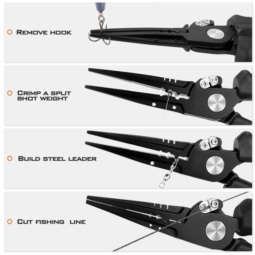 Szczęki wielofunkcyjne – chwyć i usuń dowolny haczyk z ryby za pomocą ząbkowanych szczęk lub skorzystaj ze szczelin zaciskowych, zbudować stalowy przypon. Aby szybko i bezpiecznie zacisnąć węzeł, włóż haczyk w jeden z otworów w szczękach i pociągnij haczyk, aby utworzyć ciasny węzeł.